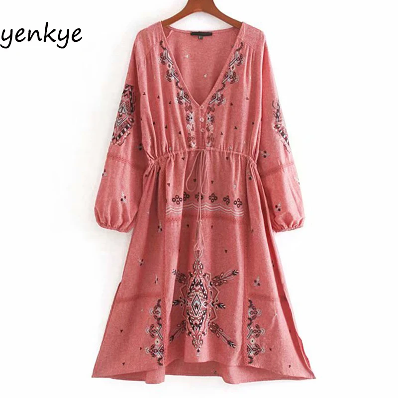 Осеннее женское платье с рукавами-фонариками, винтажное платье с вышивкой, женское платье с v-образным вырезом и завязками на талии, а-силуэт...