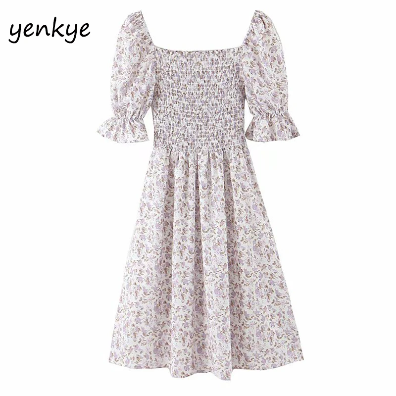 Праздничное летнее платье, женское милое платье с цветочным принтом, женский сарафан с квадратным вырезом и коротким рукавом, элегантное шифоновое платье трапециевидной формы, короткое платье
