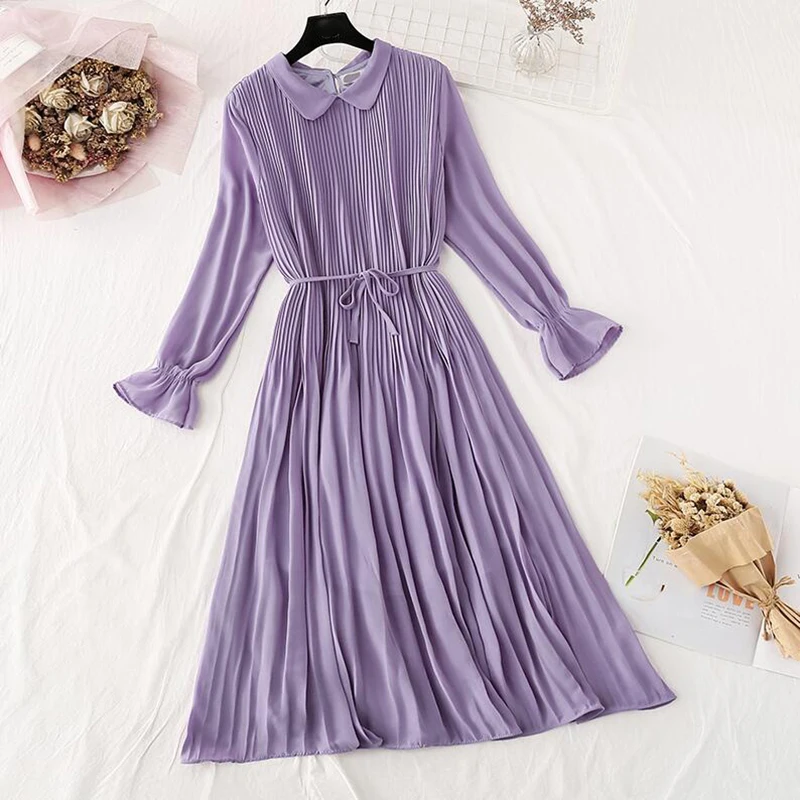 Весеннее женское шифоновое свободное Плиссированное Платье с принтом, женское повседневное однотонное винтажное платье с длинным рукавом, Элегантное Длинное платье с оборками