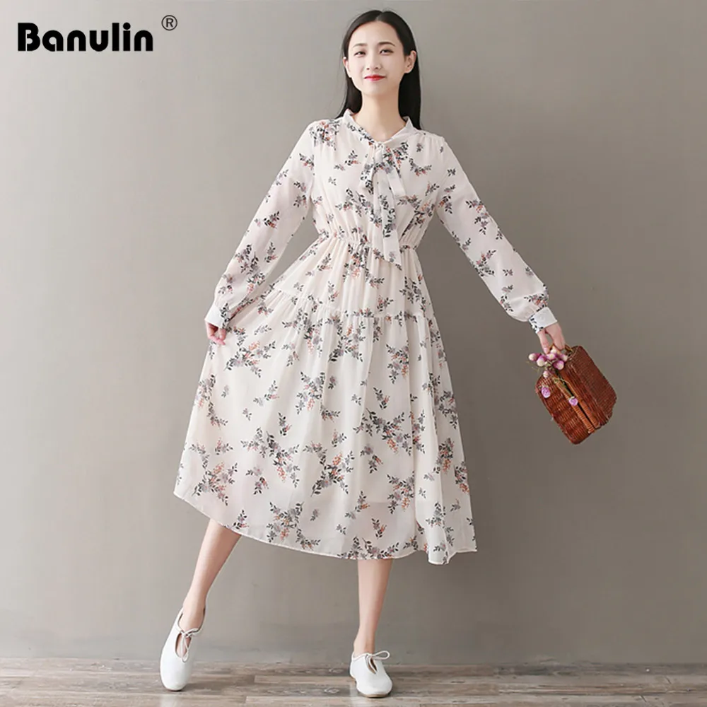 Женское длинное платье Banulin, белое шифоновое платье средней длины с цветочным принтом и бантом на весну и осень