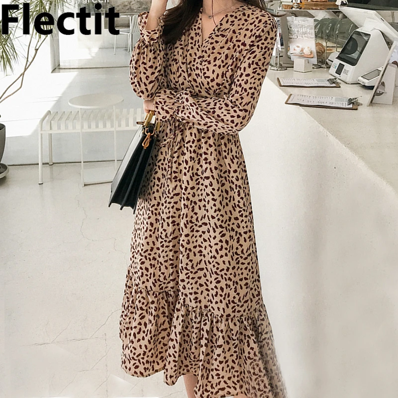 Flectit осень весна шикарное шифоновое платье с v-образным вырезом и принтом с поясом с длинным рукавом гофрированный подол тонкое платье миди Женское Vestidos *