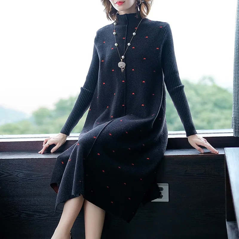 Осень Зима прямой свитер платье Свободный длинный абзац женский новый элегантный половина водолазка с длинным рукавом трикотажные платья ...