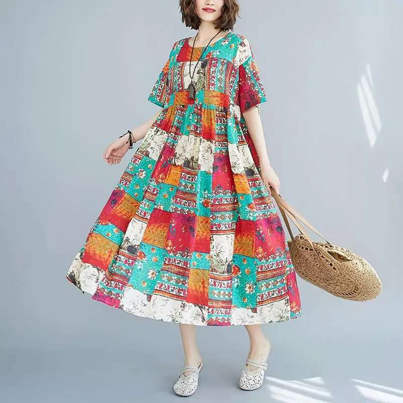 Плюс Размеры плед Цветочный принт платье Для женщин хлопок Boho Летнее пляжное длинное платье в Корейском стиле в богемном стиле 2020 женские платья Robe Femme