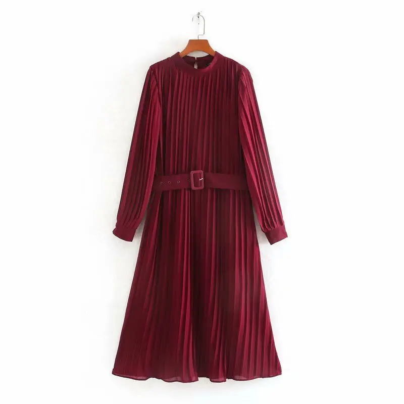 Новинка, женское элегантное однотонное плиссированное платье миди с воротником-стойкой, женские повседневные облегающие платья с длинным рукавом и пряжкой DS3406
