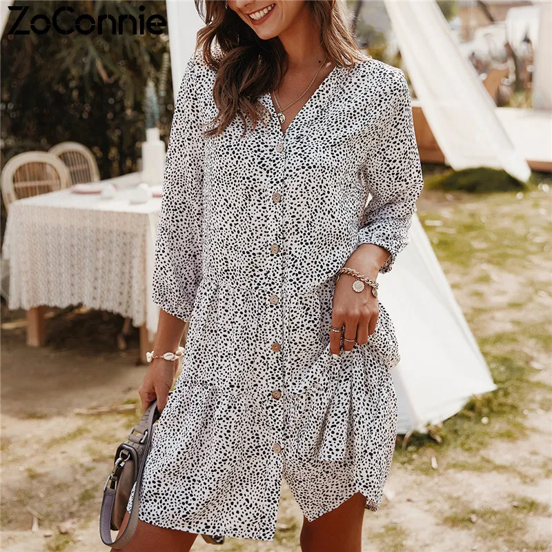 Женское короткое платье для офиса, весна-лето 2020, элегантное мини-платье с рукавом три четверти и принтом, Повседневное платье с v-образным вырезом, Vestidos