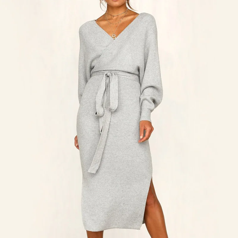 2019 осеннее женское сексуальное платье-свитер на шнуровке с v-образным вырезом, повседневный вязаный пуловер с длинным рукавом, черное эластичное платье для девушек