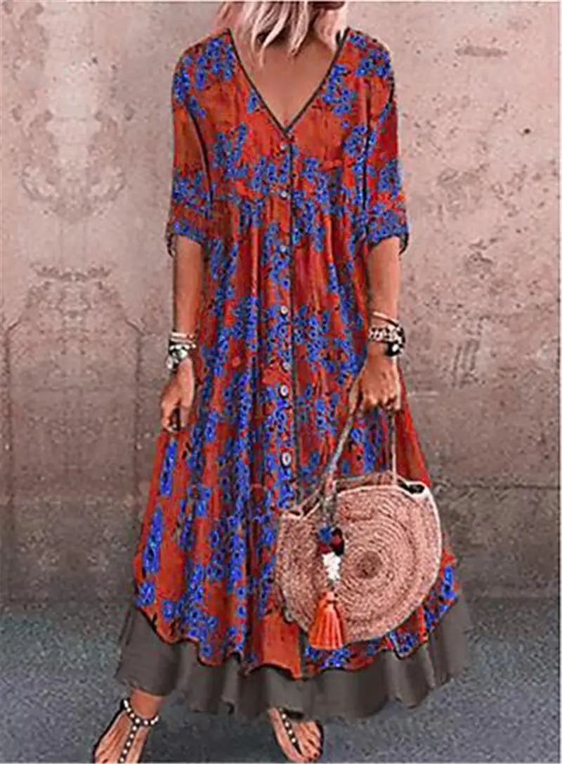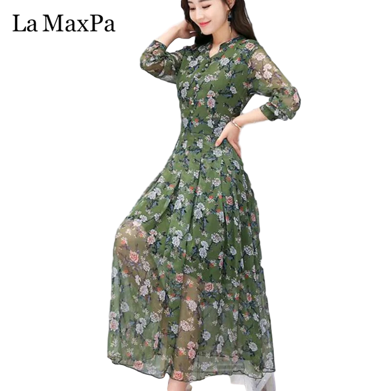 V-nack Цветочный Хлопок Лен с рисунком плюс размер платье M-3XL большой размер женское платье Свободные boho Длинное Макси платье Большие осенние ...
