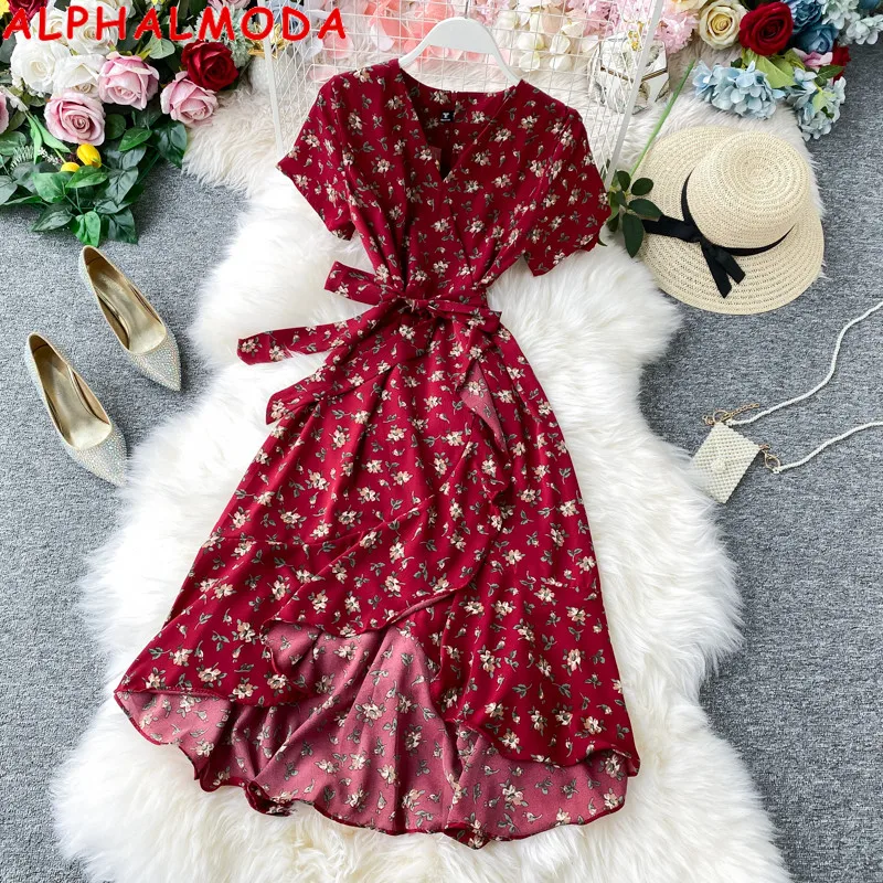ALPHALMODA 2020 летнее новое платье в стиле бохо с короткими рукавами и v-образным вырезом, с поясом, Несимметричное праздничное платье с принтом