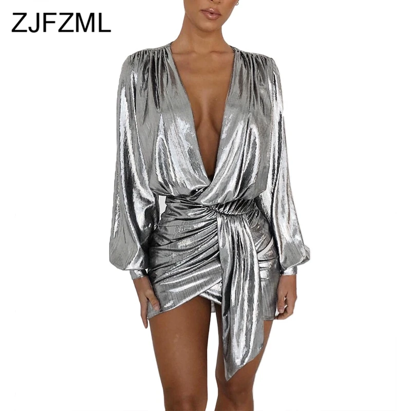 Длинные Фонари рукавом Sexy Деформация Платье Для женщин Глубокий V Neck Metallic Сияющий ночной клуб платье Повседневное дамы плиссированные нере...