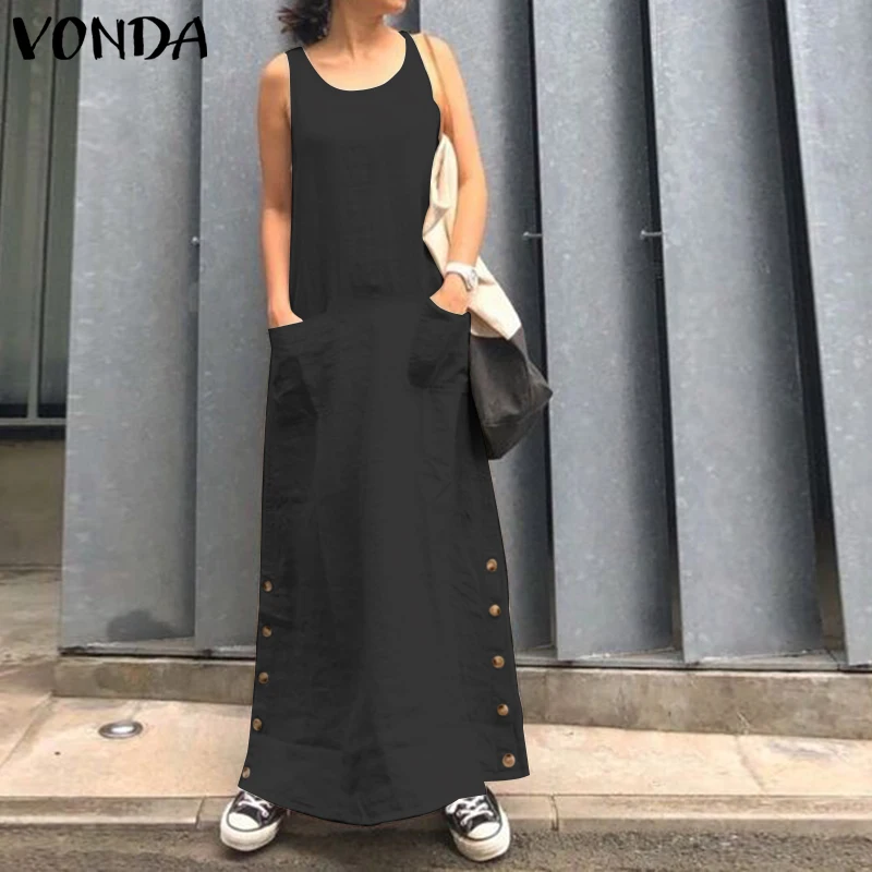 Женское длинное платье без рукавов VONDA 2020, сексуальное летнее однотонное праздничное платье с карманами и пуговицами, винтажное Повседневное платье, сарафан