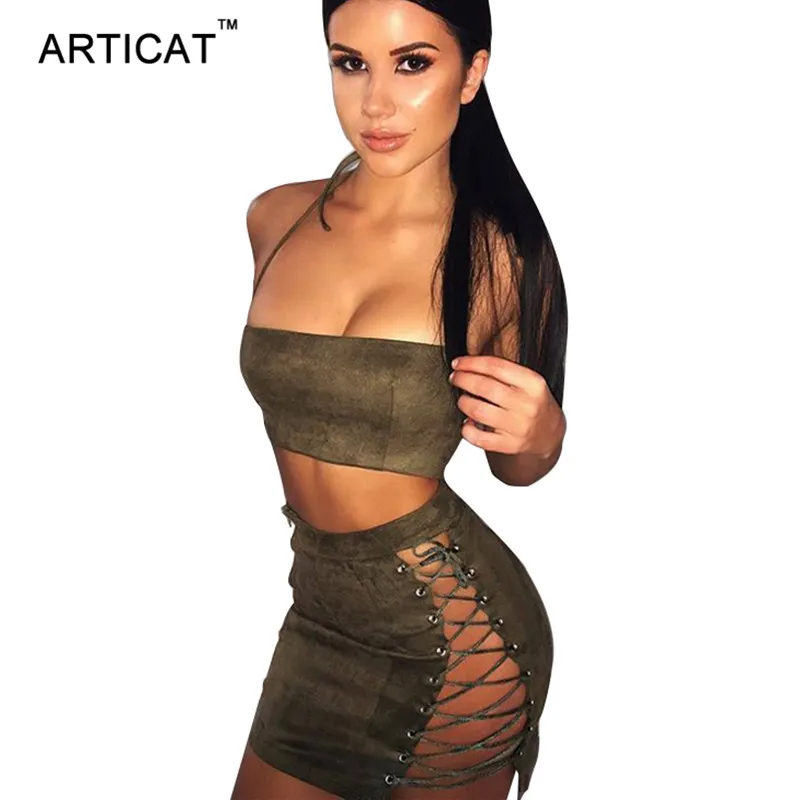 Articat пикантные замшевые без бретелек Бандажное платье Для женщин осень 2017 г. на шнуровке комплект из двух предметов Bodycon платье выдалбливают...