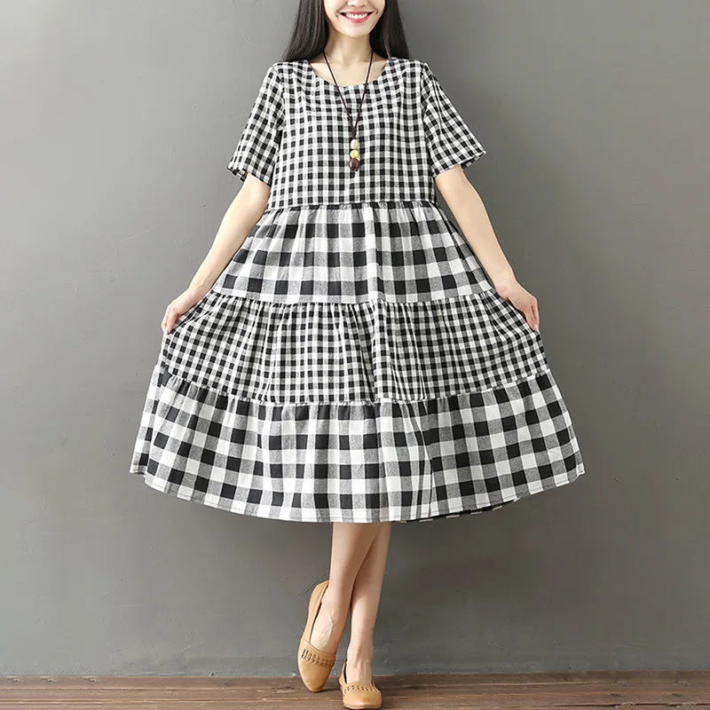 Винтажное клетчатое женское платье с принтом, круглый вырез, короткий рукав, мешковатий безрозмерный летнее платье, льняное бохо, плюс разм...