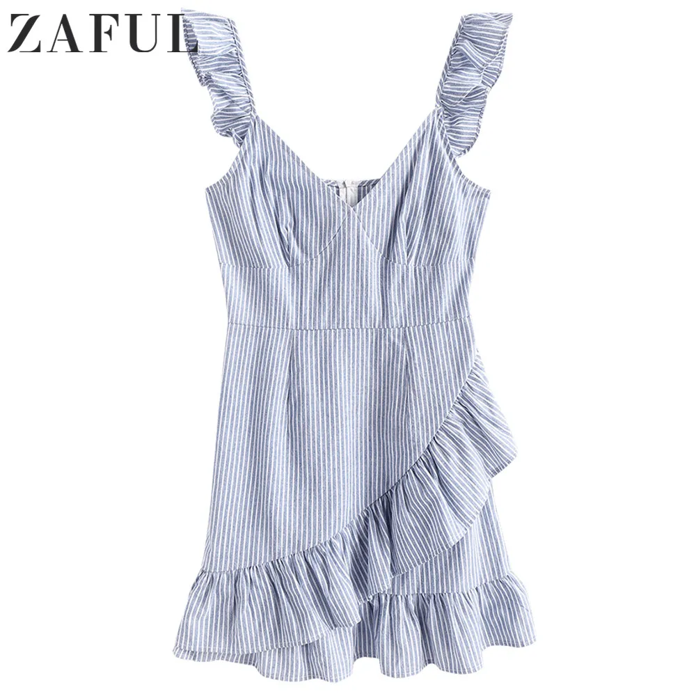 ZAFUL 2019 Полосатое женское Повседневное платье с оборками, летнее сексуальное мини-платье трапециевидной формы без рукавов с v-образным вырезом, женские платья в стиле бохо