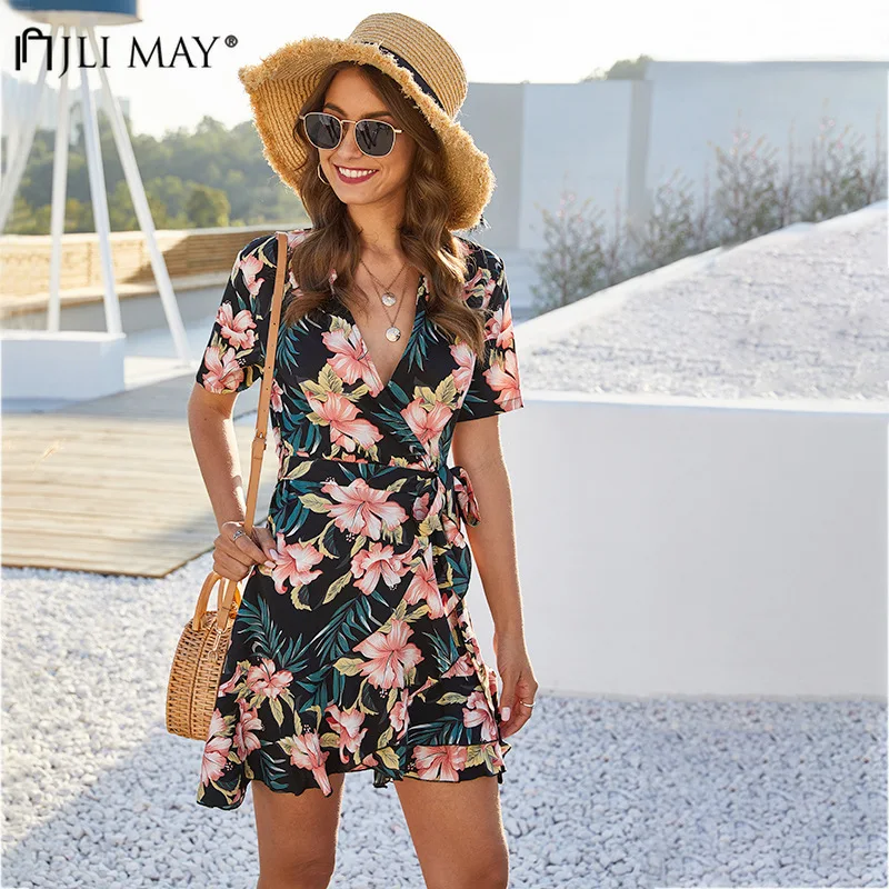 JLI может, Платья с цветочным принтом, женские летние каникулы, v-образный вырез, короткий рукав, пояс, сплайсинг, оборки, подол, Несимметричное платье