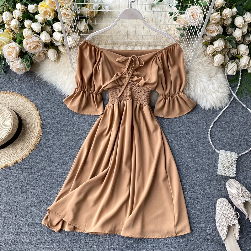 Винтажное сексуальное летнее короткое платье на завязках с открытыми плечами, женские вечерние платья трапециевидной формы с эластичным поясом, 2020