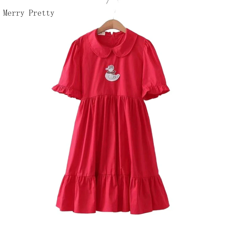 Платье трапециевидной формы с аппликацией утки из мультфильма; Сезон лето 2020 года; Плиссированное платье с рукавами-бабочками и воротником «Питер Пэн»; Милое стильное платье на шнуровке сзади
