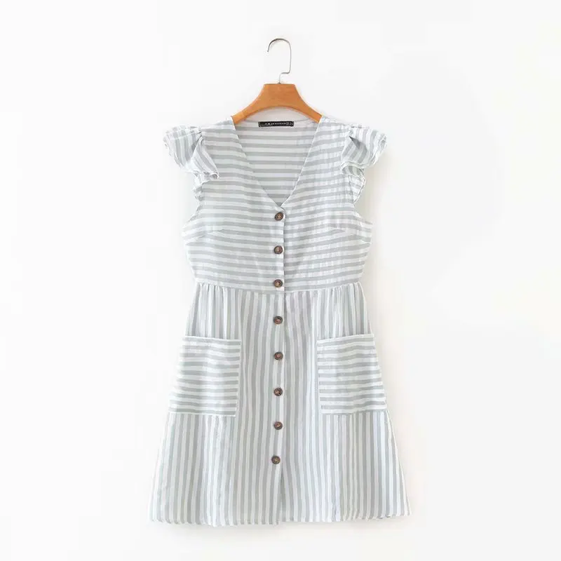 Женское винтажное мини-платье в полоску с рукавами-бабочками и карманами, модель 2020 года, повседневное однобортное платье в стиле кантри, DS3587