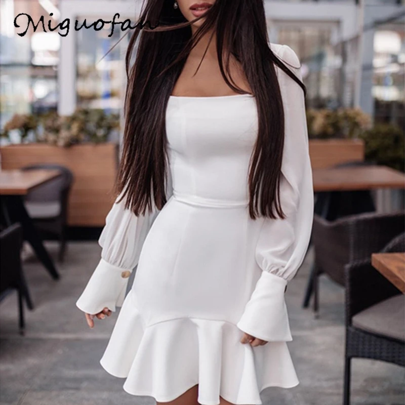 Miguofan, женские белые платья, с оборками, на шнуровке, платья, сексуальные, с вырезом лодочкой, с расклешенными длинными рукавами, Ретро стиль, ...