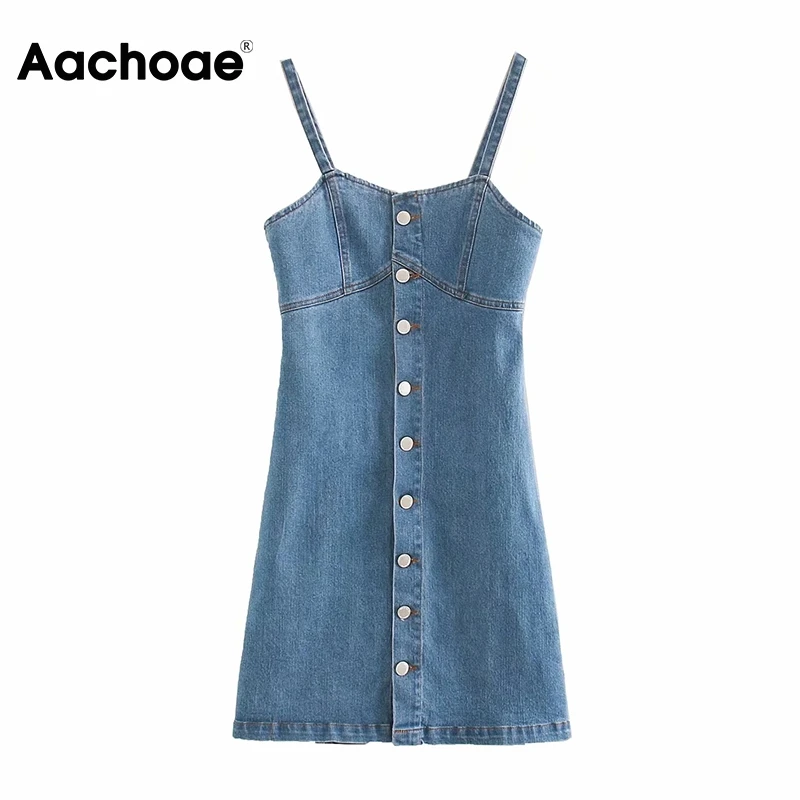 Fashion Spaghetti Strap Denim Dress Women Streetwear A Line Button Up Dress Female Sexy Sleeveless Summer Mini Dresses Robes