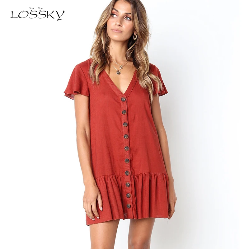 LOSSKY женское летнее платье из полиэстера трапециевидной формы однотонное с коротким рукавом v-образный вырез ДРАПИРОВАННОЕ повседневное ми...