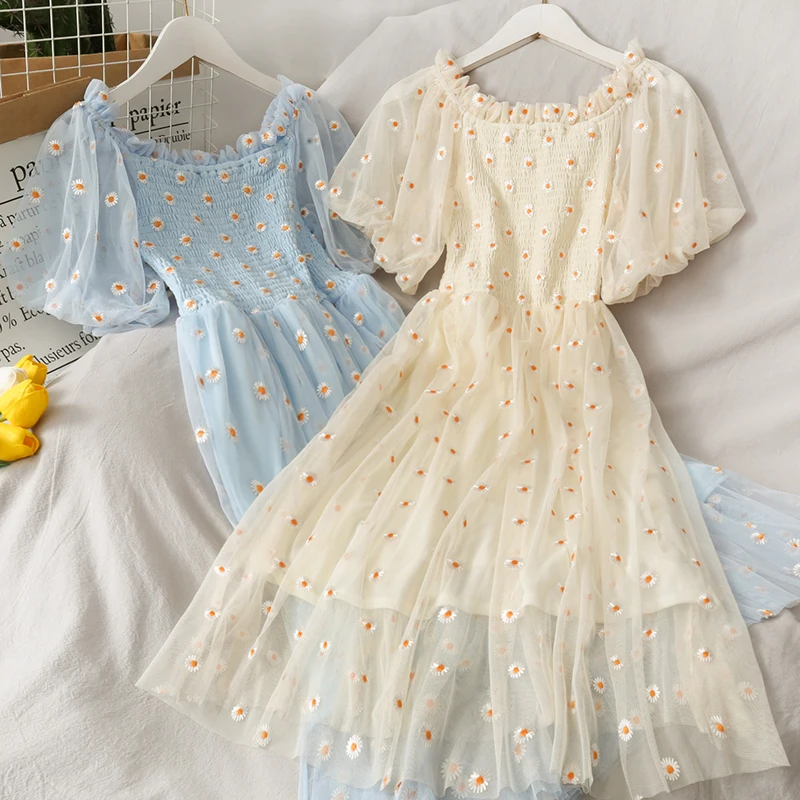 Женское длинное платье с вышивкой маргаритки во французском стиле, Сетчатое платье с вырезом лодочкой и пышными рукавами в стиле пэчворк, уличная одежда с высокой талией, 5 цветов