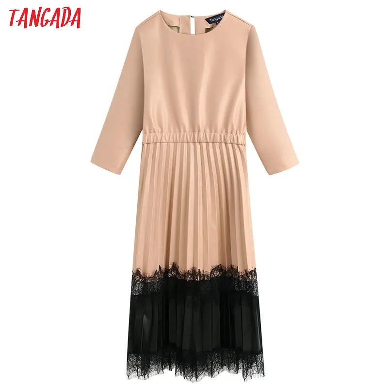 Tangada женское бежевое платье из искусственной кожи с кружевами в стиле пэчворк с длинным рукавом 2020 весенние женские миди платья vestidos BE315