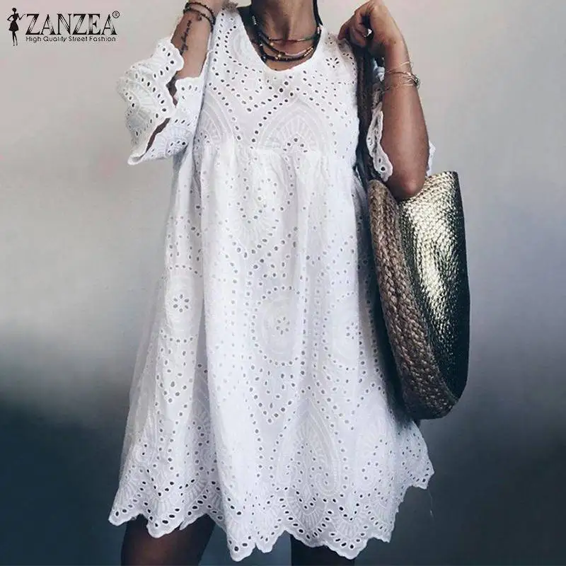 Летнее платье с кружевной отделкой ZANZEA 2019, женский короткий сарафан, повседневный винтажный однотонный короткий рукав, хлопок, Vestidos Famele Robe