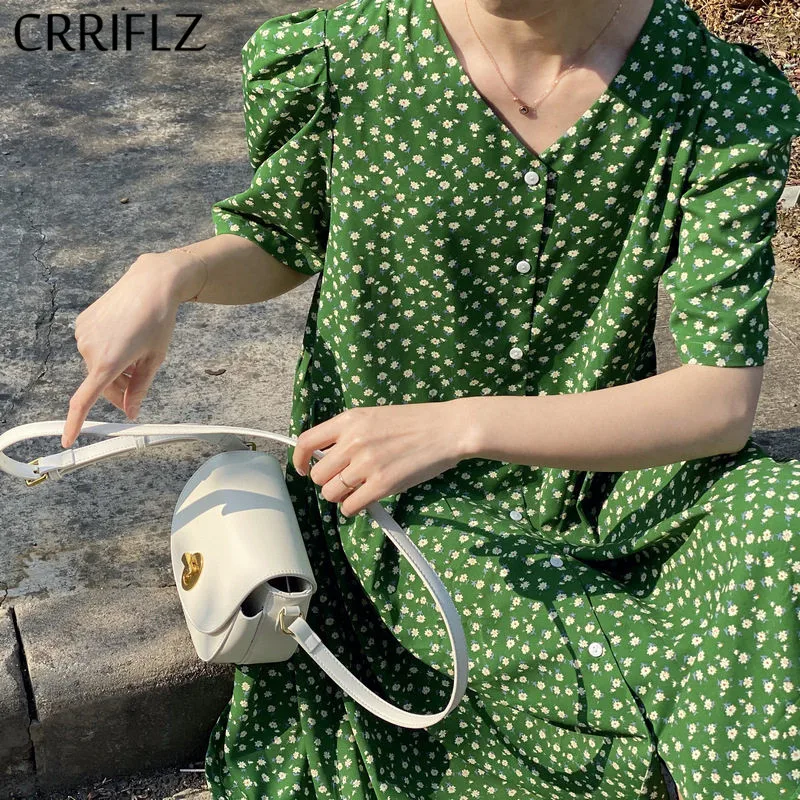 CRRIFLZ 2020 New Summer Vintage Dress Women Puff Sleeve Button V Neck Medium Long Chiffon Dress