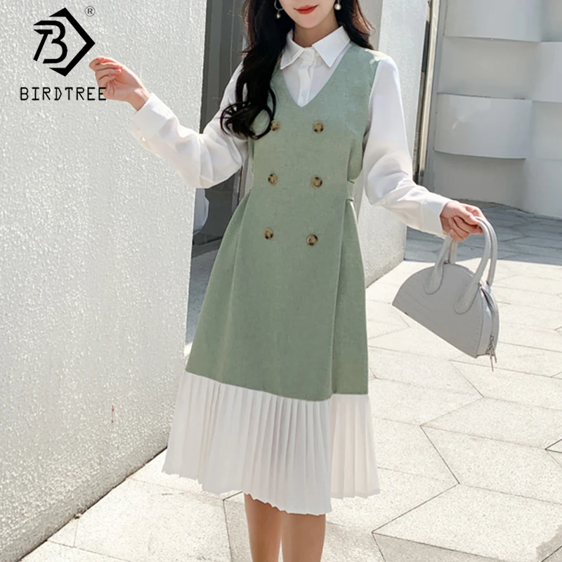 2020 весеннее Новое Женское офисное плиссированное платье, модное ТРАПЕЦИЕВИДНОЕ ПЛАТЬЕ средней длины с отложным воротником, имитация двух частей D01204O