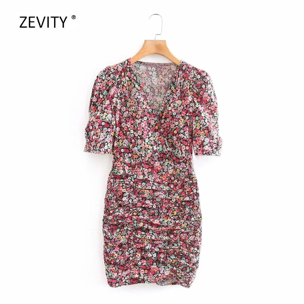 Женское винтажное мини-платье с v-образным вырезом и цветочным принтом, повседневные облегающие плиссированные вечерние платья с пышными рукавами, модель 2020, DS3880
