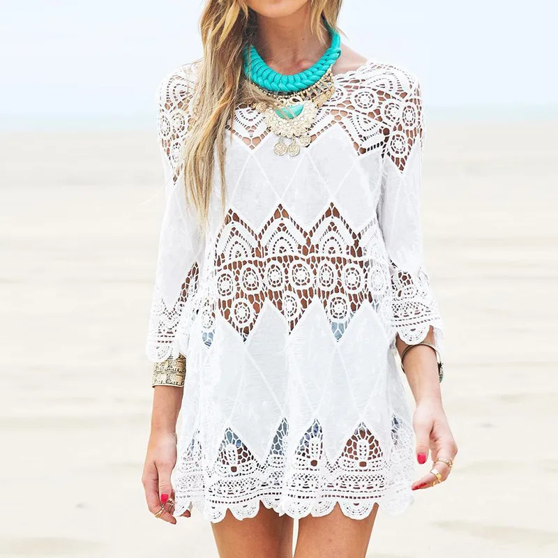 Летнее винтажное женское пляжное платье 2019, сексуальное открытое платье с кружевами и цветочным узором, вязаные крючком вечерние женские платья, богемное повседневное свободное платье