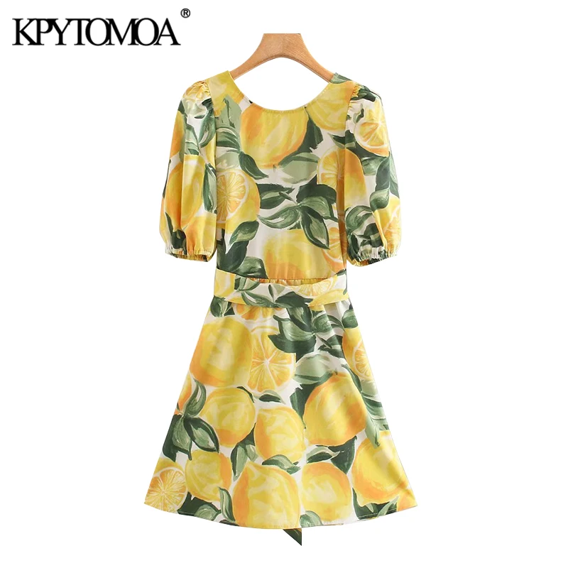 Женское винтажное мини-платье KPYTOMOA, винтажное мини-платье с принтом фруктов, v-образным вырезом и пышными рукавами, модель 2020
