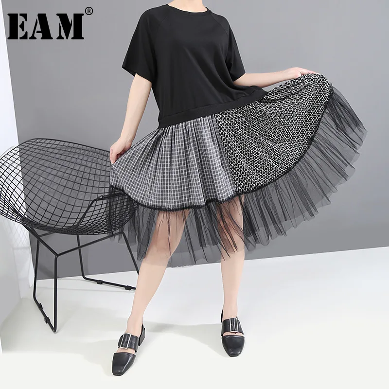Женское платье с коротким рукавом EAM, черное Сетчатое платье с раздельным темпераментом, круглый ворот, свободный крой, весна-лето 2020 1T650
