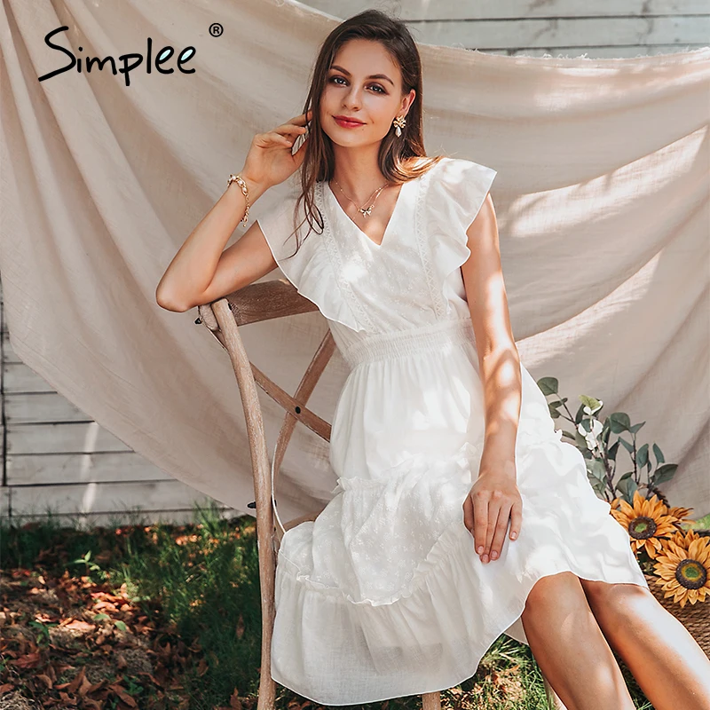 Женское платье с рукавами-фонариками Simplee, белое офисное платье средней длины с треугольным вырезом и рукавами-фонариками на лето