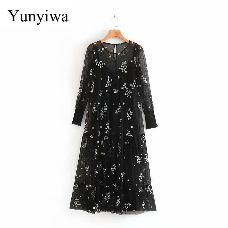 Новинка, женское элегантное платье с цветочной вышивкой, повседневное Сетчатое платье миди, женские шикарные платья с круглым вырезом и дли...