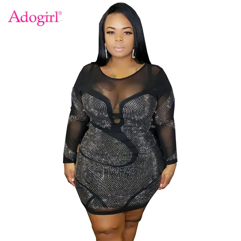 Adogirl, XL-5XL размера плюс, женское прозрачное Сетчатое платье с бриллиантами, с круглым вырезом, с длинным рукавом, облегающее, Мини, для ночного...