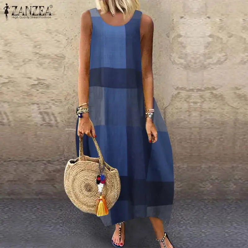 Женское винтажное платье в клетку ZANZEA, летнее Повседневное платье-Кафтан без рукавов с круглым вырезом, Пляжное платье макси, Vestido, платье Femme7