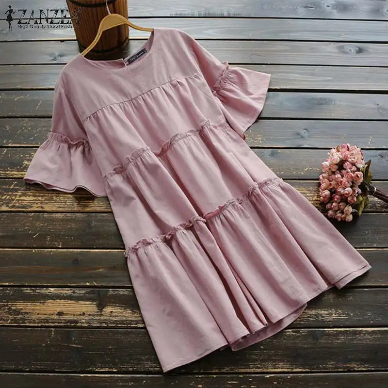 2019 женское платье ZANZEA лето осень короткий рукав Vestido Повседневная рубашка с круглым вырезом хлопок гофрированный праздничный сарафан Туник...