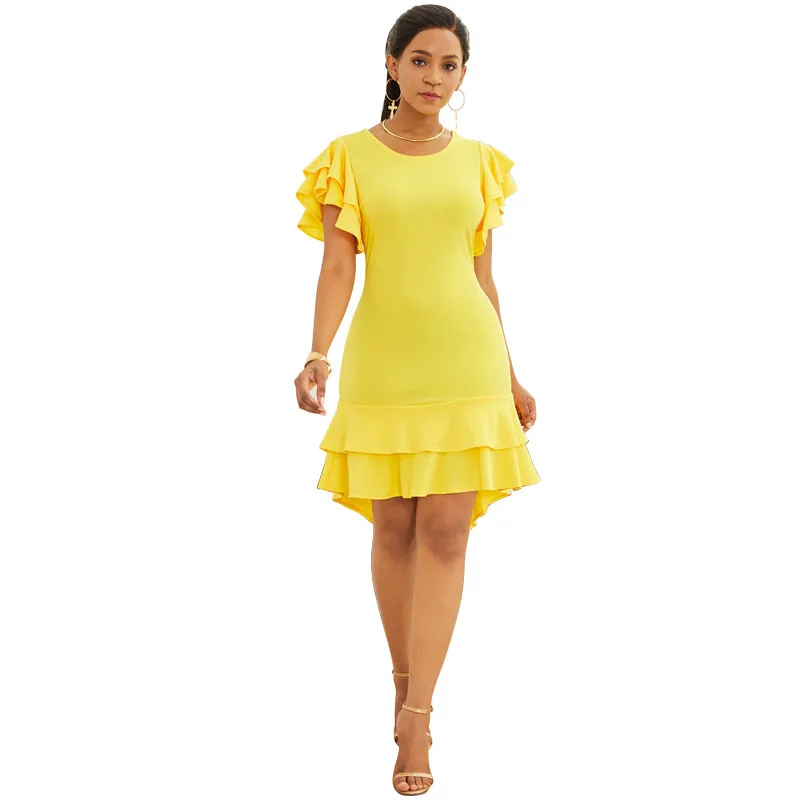 Для женщин элегантные летние модные 2019 Новое поступление пикантные стрейч Bodycon Короткий рукав оборками нерегулярные Вечеринка желтое плат...