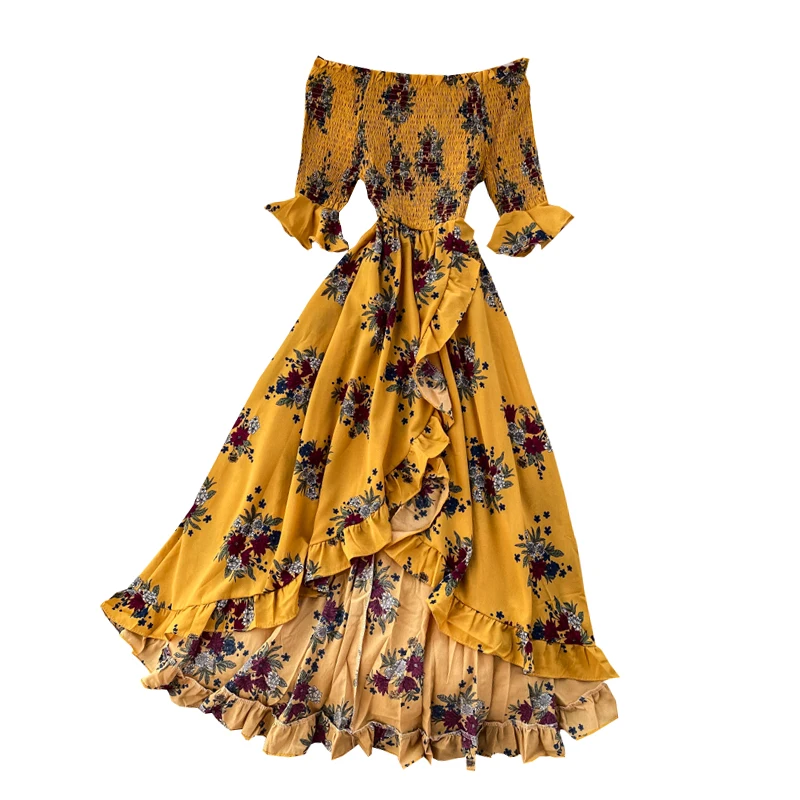 2020 летнее праздничное пляжное платье с оборками, с вырезом лодочкой, без бретелек, с принтом, Vestidos, с высокой талией, асимметричное платье, женская одежда