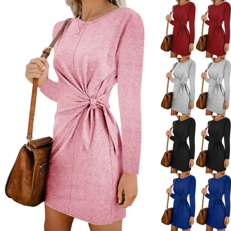 Офисное женское платье, элегантные однотонные платья, женское хлопковое осеннее теплое платье-туника с длинным рукавом, платье-рубашка ...