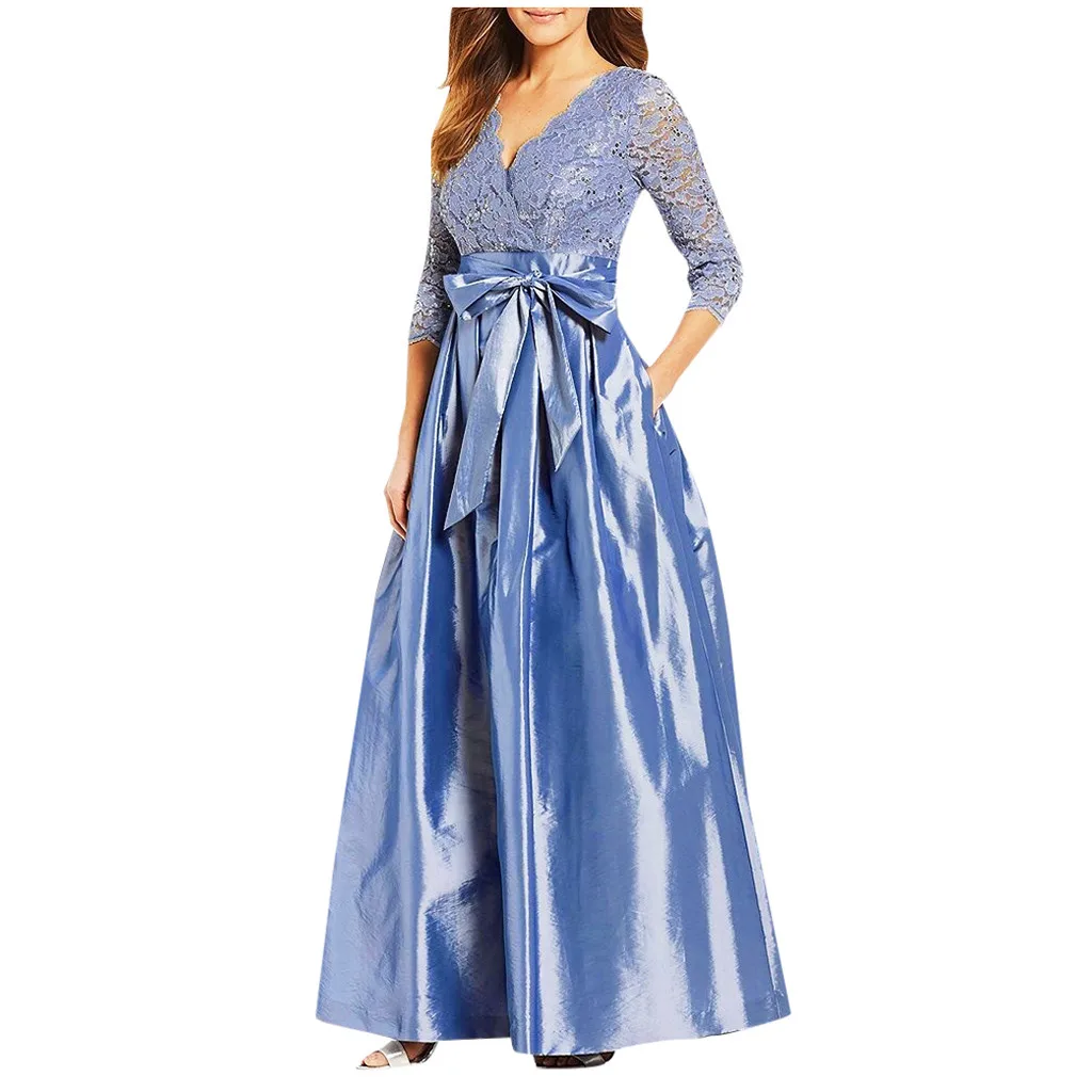 Женское Модное Длинное Платье, элегантное, v-образный вырез, кружево, пэчворк, бант, высокая талия, вечерние платья, зимняя одежда для женщин ...