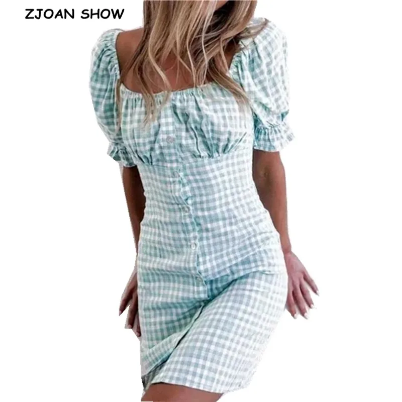 2020 весна лето французское зеленое белое клетчатое мини-платье с коротким рукавом и квадратным вырезом однобортное приталенное короткое пл...