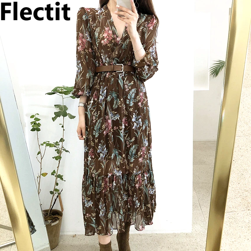 Шикарное женское платье с цветочным принтом и поясом, с длинным рукавом, v-образный вырез, цветочный принт, Длинные вечерние платья, осень-весна *