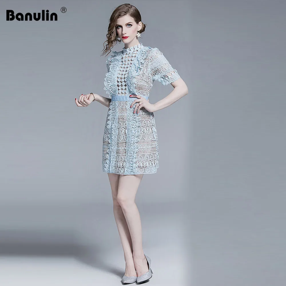Само portait 2019 весна лето Подиум выдалбливают небесно-голубое водорастворимое кружевное платье женское сексуальное мини платье с коротким ру...