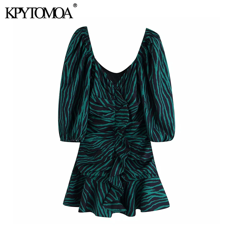 Винтажное стильное мини-платье с оборками и принтом для женщин 2019 модное женское платье с v-образным вырезом и рукавом три четверти шикарное...