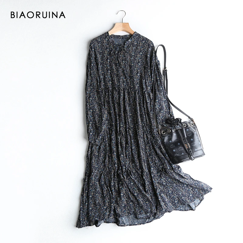BIAORUINA Women's Beach Style Floral Printed Viscose Long Dress Bow Tie Collar Ruffles Female Casual Spring Dress Vestido