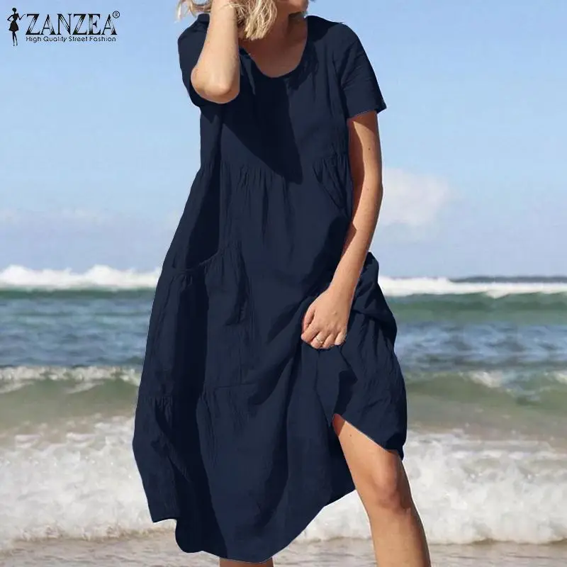 Элегантный женский сарафан миди ZANZEA 2019 летнее платье винтажная туника с коротким рукавом Vestidos женский льняной Повседневный халат большого ...