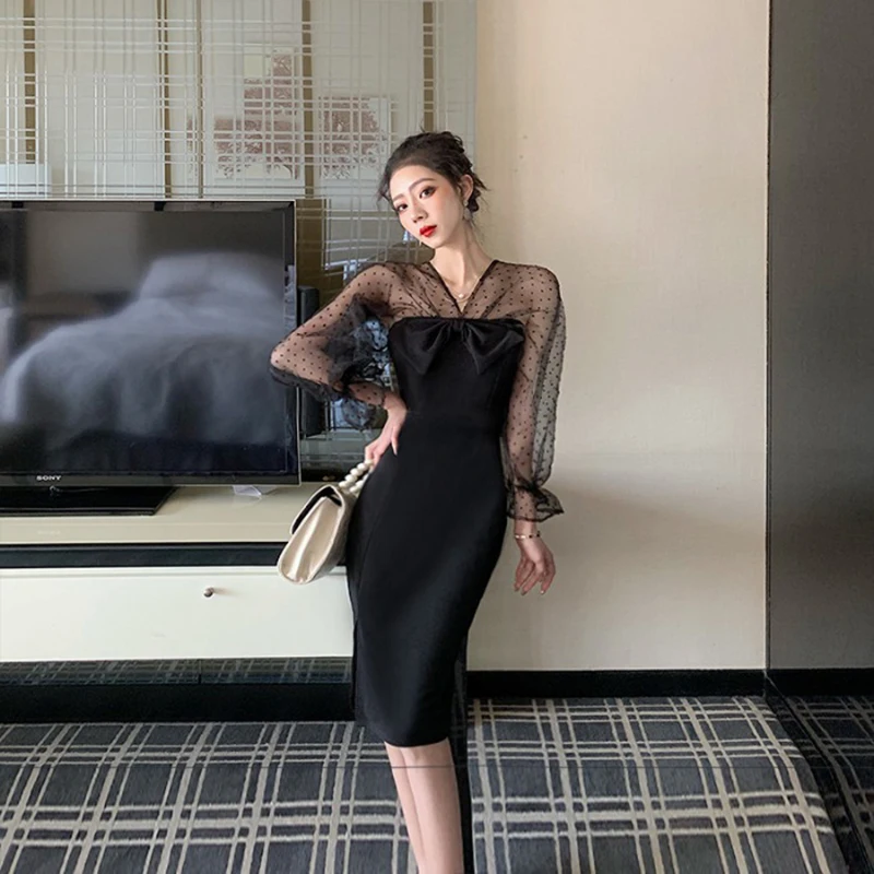 Женское платье, весна и осень, новинка, сексуальное, v-образный вырез, бант, сетка, пэчворк, тонкая посадка, сумка, бедра, платье, полный разрез, платье для женщин, ML619