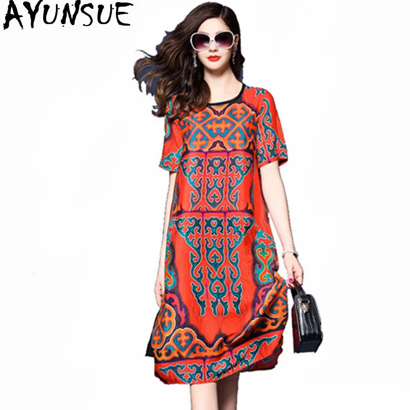 AYUNSUE 2019 Новое винтажное шелковое платье женское элегантное свободное ТРАПЕЦИЕВИДНОЕ летнее платье с цветочным принтом Повседневная Женска...
